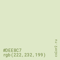 Цвет #DEE8C7 в цветовой модели RGB обозначается тремя октетами (222, 232, 199) в десятичном формате и #DEE8C7 в шестнадцатиричном (hex) формате, которые являются интенсивностью красного 222 (hex DE), интенсивность зелёного 232 (hex E8) и интенсивность синего 199 (hex C7).