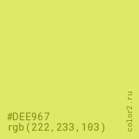 Цвет #DEE967 в цветовой модели RGB обозначается тремя октетами (222, 233, 103) в десятичном формате и #DEE967 в шестнадцатиричном (hex) формате, которые являются интенсивностью красного 222 (hex DE), интенсивность зелёного 233 (hex E9) и интенсивность синего 103 (hex 67).