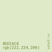 Цвет #DEEAC8 в цветовой модели RGB обозначается тремя октетами (222, 234, 200) в десятичном формате и #DEEAC8 в шестнадцатиричном (hex) формате, которые являются интенсивностью красного 222 (hex DE), интенсивность зелёного 234 (hex EA) и интенсивность синего 200 (hex C8).