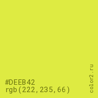 Цвет #DEEB42 в цветовой модели RGB обозначается тремя октетами (222, 235, 66) в десятичном формате и #DEEB42 в шестнадцатиричном (hex) формате, которые являются интенсивностью красного 222 (hex DE), интенсивность зелёного 235 (hex EB) и интенсивность синего 66 (hex 42).