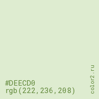 Цвет #DEECD0 в цветовой модели RGB обозначается тремя октетами (222, 236, 208) в десятичном формате и #DEECD0 в шестнадцатиричном (hex) формате, которые являются интенсивностью красного 222 (hex DE), интенсивность зелёного 236 (hex EC) и интенсивность синего 208 (hex D0).