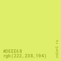 Цвет #DEEE68 в цветовой модели RGB обозначается тремя октетами (222, 238, 104) в десятичном формате и #DEEE68 в шестнадцатиричном (hex) формате, которые являются интенсивностью красного 222 (hex DE), интенсивность зелёного 238 (hex EE) и интенсивность синего 104 (hex 68).