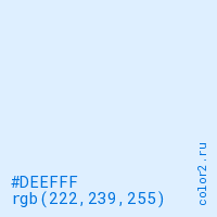 Цвет #DEEFFF в цветовой модели RGB обозначается тремя октетами (222, 239, 255) в десятичном формате и #DEEFFF в шестнадцатиричном (hex) формате, которые являются интенсивностью красного 222 (hex DE), интенсивность зелёного 239 (hex EF) и интенсивность синего 255 (hex FF).