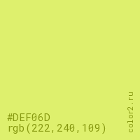 Цвет #DEF06D в цветовой модели RGB обозначается тремя октетами (222, 240, 109) в десятичном формате и #DEF06D в шестнадцатиричном (hex) формате, которые являются интенсивностью красного 222 (hex DE), интенсивность зелёного 240 (hex F0) и интенсивность синего 109 (hex 6D).