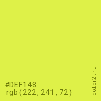 Цвет #DEF148 в цветовой модели RGB обозначается тремя октетами (222, 241, 72) в десятичном формате и #DEF148 в шестнадцатиричном (hex) формате, которые являются интенсивностью красного 222 (hex DE), интенсивность зелёного 241 (hex F1) и интенсивность синего 72 (hex 48).
