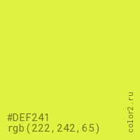 Цвет #DEF241 в цветовой модели RGB обозначается тремя октетами (222, 242, 65) в десятичном формате и #DEF241 в шестнадцатиричном (hex) формате, которые являются интенсивностью красного 222 (hex DE), интенсивность зелёного 242 (hex F2) и интенсивность синего 65 (hex 41).