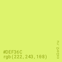 Цвет #DEF36C в цветовой модели RGB обозначается тремя октетами (222, 243, 108) в десятичном формате и #DEF36C в шестнадцатиричном (hex) формате, которые являются интенсивностью красного 222 (hex DE), интенсивность зелёного 243 (hex F3) и интенсивность синего 108 (hex 6C).
