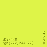 Цвет #DEF448 в цветовой модели RGB обозначается тремя октетами (222, 244, 72) в десятичном формате и #DEF448 в шестнадцатиричном (hex) формате, которые являются интенсивностью красного 222 (hex DE), интенсивность зелёного 244 (hex F4) и интенсивность синего 72 (hex 48).
