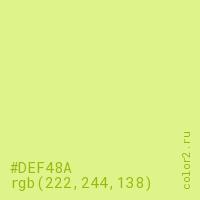 Цвет #DEF48A в цветовой модели RGB обозначается тремя октетами (222, 244, 138) в десятичном формате и #DEF48A в шестнадцатиричном (hex) формате, которые являются интенсивностью красного 222 (hex DE), интенсивность зелёного 244 (hex F4) и интенсивность синего 138 (hex 8A).