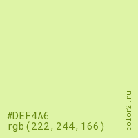 Цвет #DEF4A6 в цветовой модели RGB обозначается тремя октетами (222, 244, 166) в десятичном формате и #DEF4A6 в шестнадцатиричном (hex) формате, которые являются интенсивностью красного 222 (hex DE), интенсивность зелёного 244 (hex F4) и интенсивность синего 166 (hex A6).