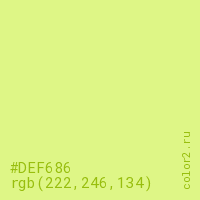 Цвет #DEF686 в цветовой модели RGB обозначается тремя октетами (222, 246, 134) в десятичном формате и #DEF686 в шестнадцатиричном (hex) формате, которые являются интенсивностью красного 222 (hex DE), интенсивность зелёного 246 (hex F6) и интенсивность синего 134 (hex 86).
