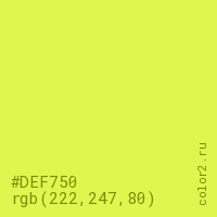 Цвет #DEF750 в цветовой модели RGB обозначается тремя октетами (222, 247, 80) в десятичном формате и #DEF750 в шестнадцатиричном (hex) формате, которые являются интенсивностью красного 222 (hex DE), интенсивность зелёного 247 (hex F7) и интенсивность синего 80 (hex 50).