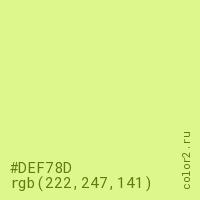 Цвет #DEF78D в цветовой модели RGB обозначается тремя октетами (222, 247, 141) в десятичном формате и #DEF78D в шестнадцатиричном (hex) формате, которые являются интенсивностью красного 222 (hex DE), интенсивность зелёного 247 (hex F7) и интенсивность синего 141 (hex 8D).