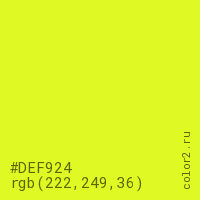 Цвет #DEF924 в цветовой модели RGB обозначается тремя октетами (222, 249, 36) в десятичном формате и #DEF924 в шестнадцатиричном (hex) формате, которые являются интенсивностью красного 222 (hex DE), интенсивность зелёного 249 (hex F9) и интенсивность синего 36 (hex 24).