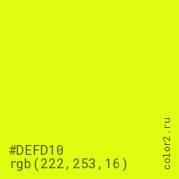 Цвет #DEFD10 в цветовой модели RGB обозначается тремя октетами (222, 253, 16) в десятичном формате и #DEFD10 в шестнадцатиричном (hex) формате, которые являются интенсивностью красного 222 (hex DE), интенсивность зелёного 253 (hex FD) и интенсивность синего 16 (hex 10).