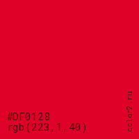 Цвет #DF0128 в цветовой модели RGB обозначается тремя октетами (223, 1, 40) в десятичном формате и #DF0128 в шестнадцатиричном (hex) формате, которые являются интенсивностью красного 223 (hex DF), интенсивность зелёного 1 (hex 01) и интенсивность синего 40 (hex 28).
