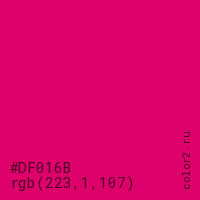 Цвет #DF016B в цветовой модели RGB обозначается тремя октетами (223, 1, 107) в десятичном формате и #DF016B в шестнадцатиричном (hex) формате, которые являются интенсивностью красного 223 (hex DF), интенсивность зелёного 1 (hex 01) и интенсивность синего 107 (hex 6B).
