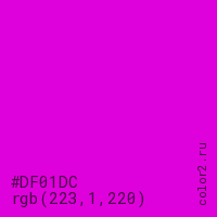 Цвет #DF01DC в цветовой модели RGB обозначается тремя октетами (223, 1, 220) в десятичном формате и #DF01DC в шестнадцатиричном (hex) формате, которые являются интенсивностью красного 223 (hex DF), интенсивность зелёного 1 (hex 01) и интенсивность синего 220 (hex DC).