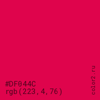 Цвет #DF044C в цветовой модели RGB обозначается тремя октетами (223, 4, 76) в десятичном формате и #DF044C в шестнадцатиричном (hex) формате, которые являются интенсивностью красного 223 (hex DF), интенсивность зелёного 4 (hex 04) и интенсивность синего 76 (hex 4C).