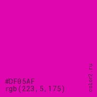 Цвет #DF05AF в цветовой модели RGB обозначается тремя октетами (223, 5, 175) в десятичном формате и #DF05AF в шестнадцатиричном (hex) формате, которые являются интенсивностью красного 223 (hex DF), интенсивность зелёного 5 (hex 05) и интенсивность синего 175 (hex AF).