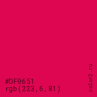Цвет #DF0651 в цветовой модели RGB обозначается тремя октетами (223, 6, 81) в десятичном формате и #DF0651 в шестнадцатиричном (hex) формате, которые являются интенсивностью красного 223 (hex DF), интенсивность зелёного 6 (hex 06) и интенсивность синего 81 (hex 51).