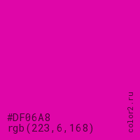 Цвет #DF06A8 в цветовой модели RGB обозначается тремя октетами (223, 6, 168) в десятичном формате и #DF06A8 в шестнадцатиричном (hex) формате, которые являются интенсивностью красного 223 (hex DF), интенсивность зелёного 6 (hex 06) и интенсивность синего 168 (hex A8).