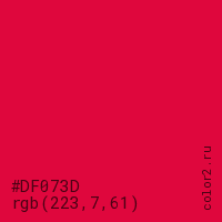 Цвет #DF073D в цветовой модели RGB обозначается тремя октетами (223, 7, 61) в десятичном формате и #DF073D в шестнадцатиричном (hex) формате, которые являются интенсивностью красного 223 (hex DF), интенсивность зелёного 7 (hex 07) и интенсивность синего 61 (hex 3D).