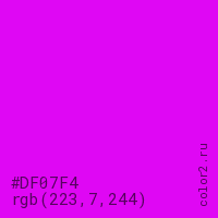 Цвет #DF07F4 в цветовой модели RGB обозначается тремя октетами (223, 7, 244) в десятичном формате и #DF07F4 в шестнадцатиричном (hex) формате, которые являются интенсивностью красного 223 (hex DF), интенсивность зелёного 7 (hex 07) и интенсивность синего 244 (hex F4).