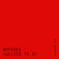 Цвет #DF0A08 в цветовой модели RGB обозначается тремя октетами (223, 10, 8) в десятичном формате и #DF0A08 в шестнадцатиричном (hex) формате, которые являются интенсивностью красного 223 (hex DF), интенсивность зелёного 10 (hex 0A) и интенсивность синего 8 (hex 08).