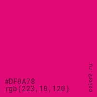 Цвет #DF0A78 в цветовой модели RGB обозначается тремя октетами (223, 10, 120) в десятичном формате и #DF0A78 в шестнадцатиричном (hex) формате, которые являются интенсивностью красного 223 (hex DF), интенсивность зелёного 10 (hex 0A) и интенсивность синего 120 (hex 78).