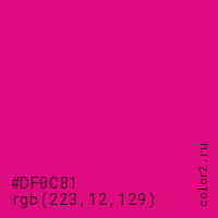Цвет #DF0C81 в цветовой модели RGB обозначается тремя октетами (223, 12, 129) в десятичном формате и #DF0C81 в шестнадцатиричном (hex) формате, которые являются интенсивностью красного 223 (hex DF), интенсивность зелёного 12 (hex 0C) и интенсивность синего 129 (hex 81).