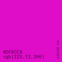 Цвет #DF0CC8 в цветовой модели RGB обозначается тремя октетами (223, 12, 200) в десятичном формате и #DF0CC8 в шестнадцатиричном (hex) формате, которые являются интенсивностью красного 223 (hex DF), интенсивность зелёного 12 (hex 0C) и интенсивность синего 200 (hex C8).