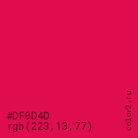 Цвет #DF0D4D в цветовой модели RGB обозначается тремя октетами (223, 13, 77) в десятичном формате и #DF0D4D в шестнадцатиричном (hex) формате, которые являются интенсивностью красного 223 (hex DF), интенсивность зелёного 13 (hex 0D) и интенсивность синего 77 (hex 4D).