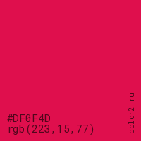 Цвет #DF0F4D в цветовой модели RGB обозначается тремя октетами (223, 15, 77) в десятичном формате и #DF0F4D в шестнадцатиричном (hex) формате, которые являются интенсивностью красного 223 (hex DF), интенсивность зелёного 15 (hex 0F) и интенсивность синего 77 (hex 4D).
