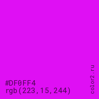 Цвет #DF0FF4 в цветовой модели RGB обозначается тремя октетами (223, 15, 244) в десятичном формате и #DF0FF4 в шестнадцатиричном (hex) формате, которые являются интенсивностью красного 223 (hex DF), интенсивность зелёного 15 (hex 0F) и интенсивность синего 244 (hex F4).