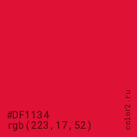 Цвет #DF1134 в цветовой модели RGB обозначается тремя октетами (223, 17, 52) в десятичном формате и #DF1134 в шестнадцатиричном (hex) формате, которые являются интенсивностью красного 223 (hex DF), интенсивность зелёного 17 (hex 11) и интенсивность синего 52 (hex 34).