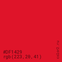 Цвет #DF1429 в цветовой модели RGB обозначается тремя октетами (223, 20, 41) в десятичном формате и #DF1429 в шестнадцатиричном (hex) формате, которые являются интенсивностью красного 223 (hex DF), интенсивность зелёного 20 (hex 14) и интенсивность синего 41 (hex 29).