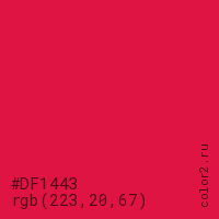 Цвет #DF1443 в цветовой модели RGB обозначается тремя октетами (223, 20, 67) в десятичном формате и #DF1443 в шестнадцатиричном (hex) формате, которые являются интенсивностью красного 223 (hex DF), интенсивность зелёного 20 (hex 14) и интенсивность синего 67 (hex 43).