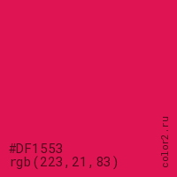 Цвет #DF1553 в цветовой модели RGB обозначается тремя октетами (223, 21, 83) в десятичном формате и #DF1553 в шестнадцатиричном (hex) формате, которые являются интенсивностью красного 223 (hex DF), интенсивность зелёного 21 (hex 15) и интенсивность синего 83 (hex 53).
