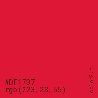 Цвет #DF1737 в цветовой модели RGB обозначается тремя октетами (223, 23, 55) в десятичном формате и #DF1737 в шестнадцатиричном (hex) формате, которые являются интенсивностью красного 223 (hex DF), интенсивность зелёного 23 (hex 17) и интенсивность синего 55 (hex 37).