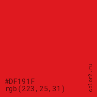 Цвет #DF191F в цветовой модели RGB обозначается тремя октетами (223, 25, 31) в десятичном формате и #DF191F в шестнадцатиричном (hex) формате, которые являются интенсивностью красного 223 (hex DF), интенсивность зелёного 25 (hex 19) и интенсивность синего 31 (hex 1F).