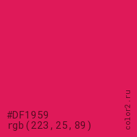 Цвет #DF1959 в цветовой модели RGB обозначается тремя октетами (223, 25, 89) в десятичном формате и #DF1959 в шестнадцатиричном (hex) формате, которые являются интенсивностью красного 223 (hex DF), интенсивность зелёного 25 (hex 19) и интенсивность синего 89 (hex 59).