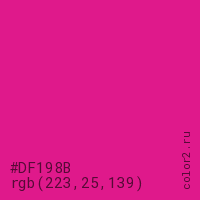 Цвет #DF198B в цветовой модели RGB обозначается тремя октетами (223, 25, 139) в десятичном формате и #DF198B в шестнадцатиричном (hex) формате, которые являются интенсивностью красного 223 (hex DF), интенсивность зелёного 25 (hex 19) и интенсивность синего 139 (hex 8B).