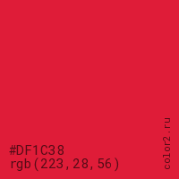 Цвет #DF1C38 в цветовой модели RGB обозначается тремя октетами (223, 28, 56) в десятичном формате и #DF1C38 в шестнадцатиричном (hex) формате, которые являются интенсивностью красного 223 (hex DF), интенсивность зелёного 28 (hex 1C) и интенсивность синего 56 (hex 38).