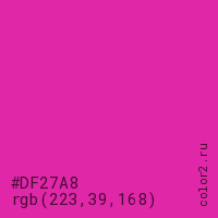 Цвет #DF27A8 в цветовой модели RGB обозначается тремя октетами (223, 39, 168) в десятичном формате и #DF27A8 в шестнадцатиричном (hex) формате, которые являются интенсивностью красного 223 (hex DF), интенсивность зелёного 39 (hex 27) и интенсивность синего 168 (hex A8).