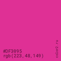 Цвет #DF3095 в цветовой модели RGB обозначается тремя октетами (223, 48, 149) в десятичном формате и #DF3095 в шестнадцатиричном (hex) формате, которые являются интенсивностью красного 223 (hex DF), интенсивность зелёного 48 (hex 30) и интенсивность синего 149 (hex 95).