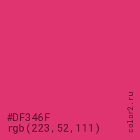 Цвет #DF346F в цветовой модели RGB обозначается тремя октетами (223, 52, 111) в десятичном формате и #DF346F в шестнадцатиричном (hex) формате, которые являются интенсивностью красного 223 (hex DF), интенсивность зелёного 52 (hex 34) и интенсивность синего 111 (hex 6F).