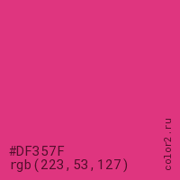 Цвет #DF357F в цветовой модели RGB обозначается тремя октетами (223, 53, 127) в десятичном формате и #DF357F в шестнадцатиричном (hex) формате, которые являются интенсивностью красного 223 (hex DF), интенсивность зелёного 53 (hex 35) и интенсивность синего 127 (hex 7F).