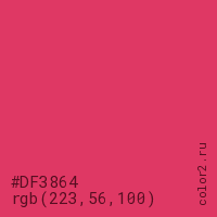 Цвет #DF3864 в цветовой модели RGB обозначается тремя октетами (223, 56, 100) в десятичном формате и #DF3864 в шестнадцатиричном (hex) формате, которые являются интенсивностью красного 223 (hex DF), интенсивность зелёного 56 (hex 38) и интенсивность синего 100 (hex 64).