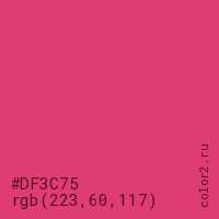 Цвет #DF3C75 в цветовой модели RGB обозначается тремя октетами (223, 60, 117) в десятичном формате и #DF3C75 в шестнадцатиричном (hex) формате, которые являются интенсивностью красного 223 (hex DF), интенсивность зелёного 60 (hex 3C) и интенсивность синего 117 (hex 75).